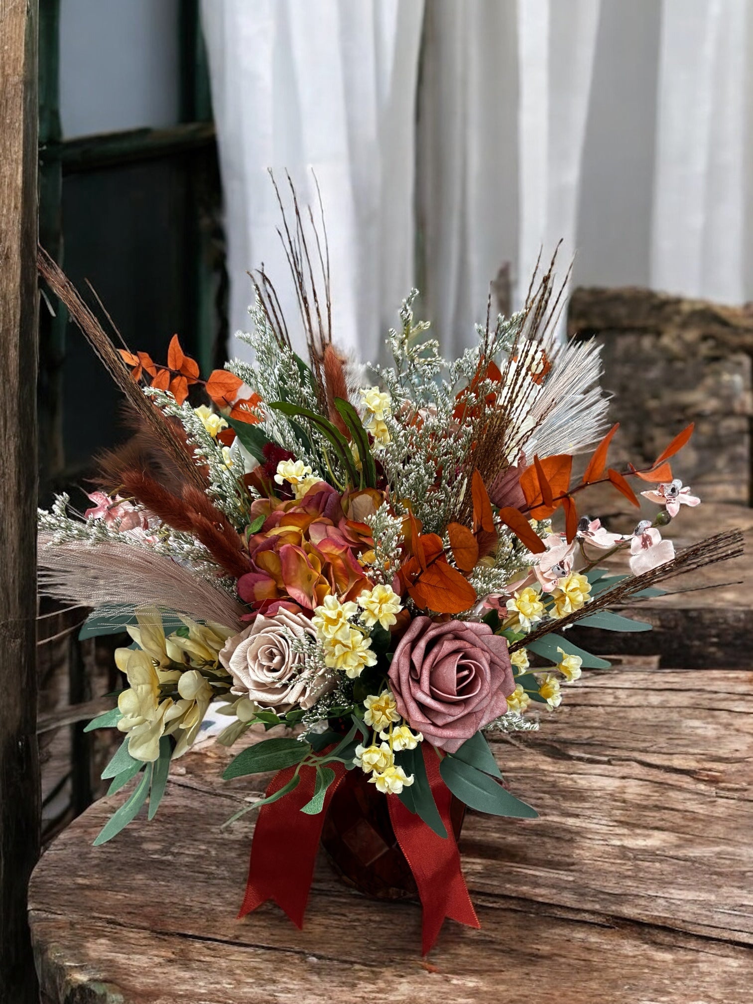 This striking dried and artificial fall arrangement blends rustic charm with refined elegance. Soft blush roses and golden hydrangea are accented with vivid orange eucalyptus, golden yellow blossoms, and delicate pink touches. Wisps of pampas, natural grasses, and preserved botanicals add height and texture, creating a warm harvest-inspired display. Designed in a deep vase with a bold ribbon accent, this arrangement brings the beauty of autumn indoors and lasts season after season — the perfect centerpiece for fall gatherings or a timeless statement piece for your home décor.