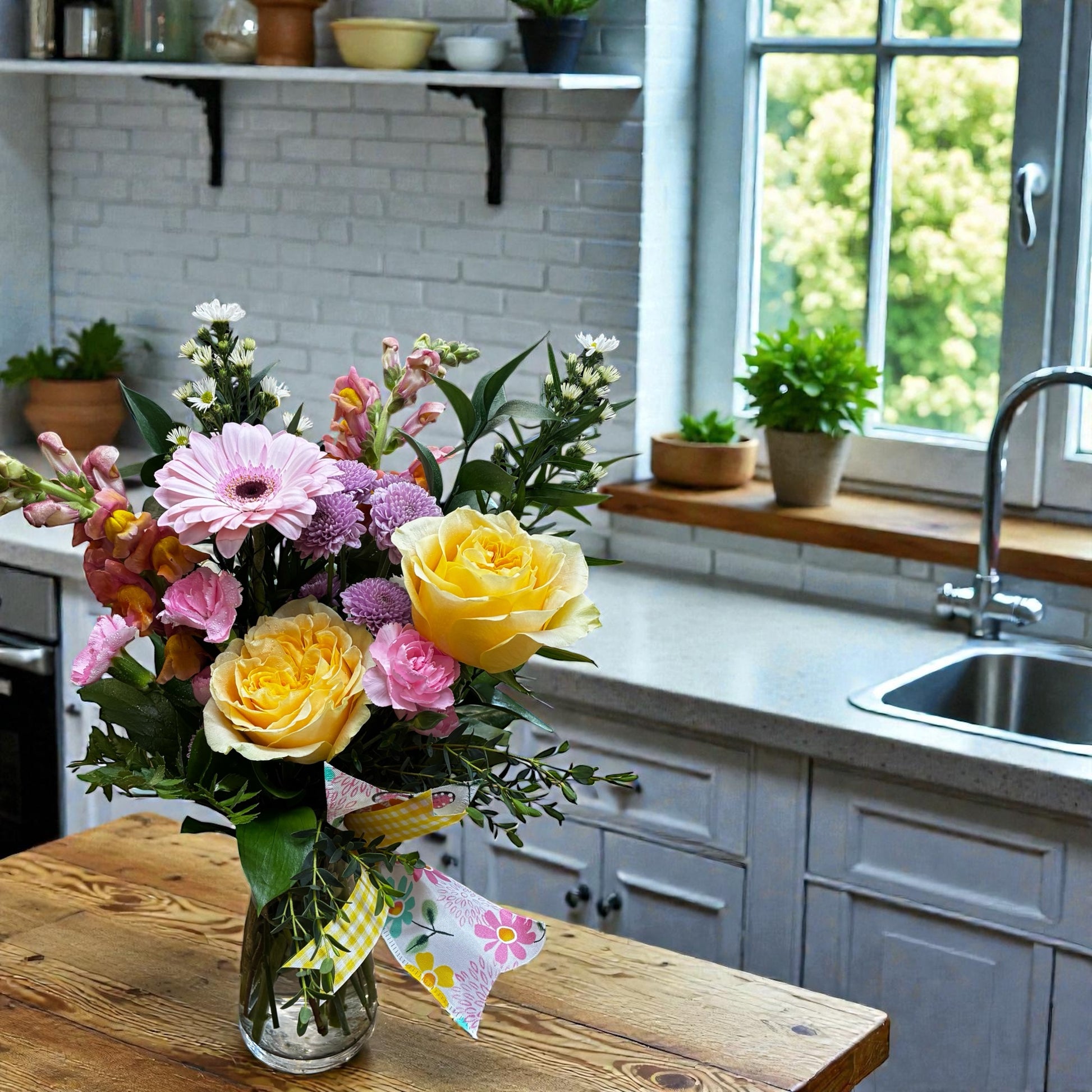 A midsize, all-around arrangement featuring a mix of fresh focal blooms, seasonal flowers, and lush greenery. Designed to feel cheerful and balanced, this arrangement is a great choice for birthdays, thank-yous, or just because.