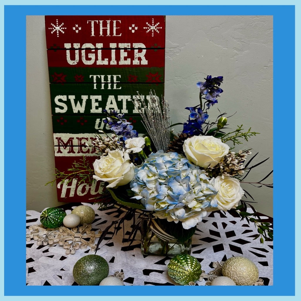 Beautiful frosty bouquet perfect for the winter lover In your life. Created with our freshest flowers in blues and whites.
