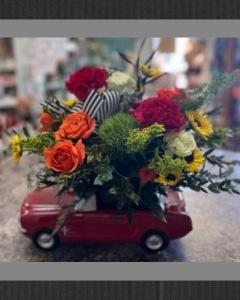 This ceramic mustang is one of the fun new additions in our masculine collection of vintage cars and trucks. You will impress the car enthusiast in your life with this cute bouquet in a keepsake red mustang.