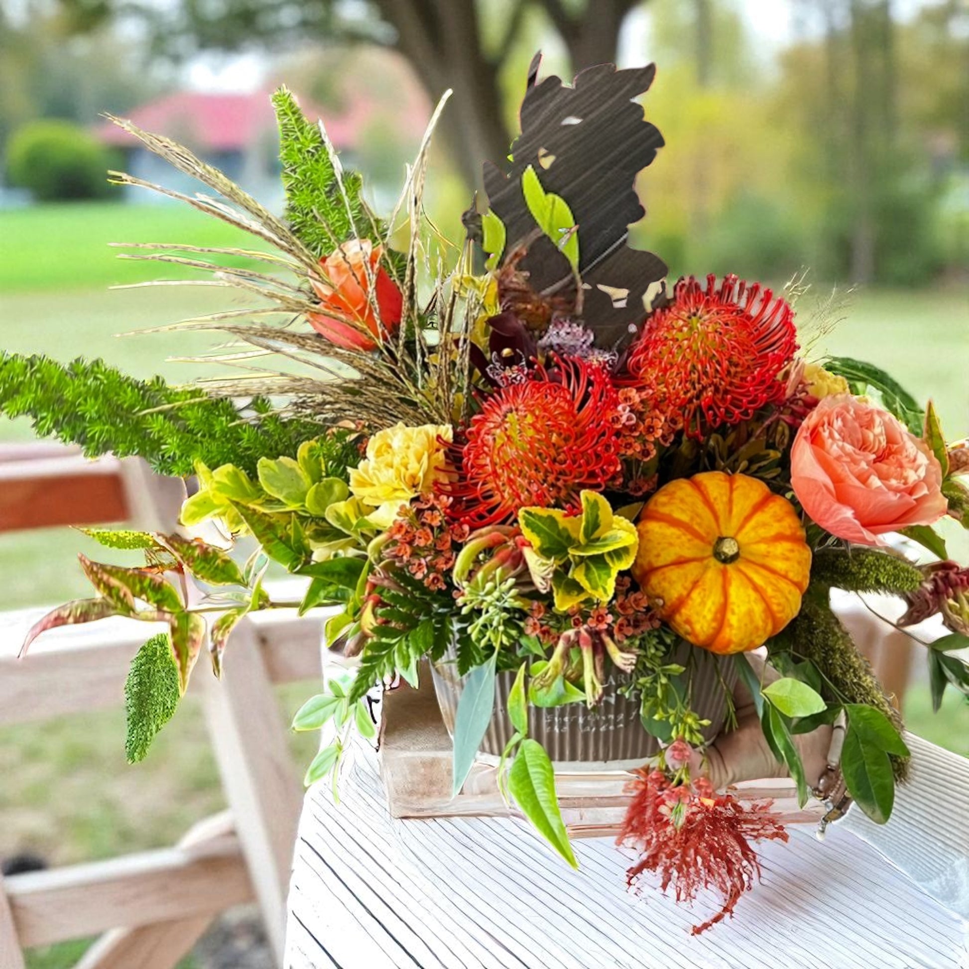 A rich, textural Thanksgiving centerpiece that celebrates the beauty of fall’s harvest. Featuring vibrant orange pincushion protea, coral garden roses, golden mums, fall accents, and rustic foliage in a ceramic vase. Layers of greenery, and autumnal textures create a warm, inviting display perfect for your holiday table or entryway.
